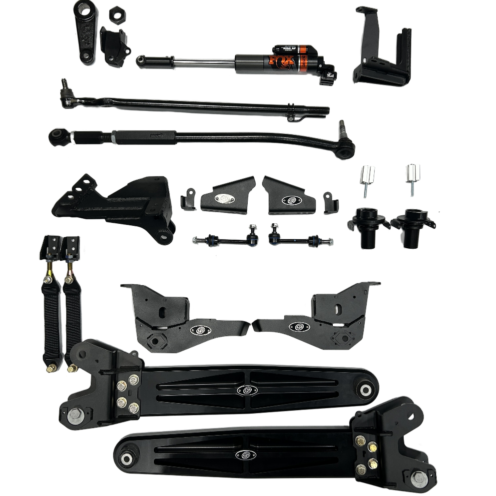 Our top of the line kit for those looking to raise the front of their truck 2.5″ while leaving the rear height alone. Our fully loaded kit includes everything we manufacture to improve the ride of your Super Duty including our Steady Track Steering System, Billet Radius Arms, Radius Arm Drops, Adjustable Track Rod, Track Rod Bracket and more! Scroll down to find more about all that is included. Level your truck while greatly improving the ride quality and towing performance at the same time. Add on the optional Torxz Traction Control Bars for the ultimate towing experience.