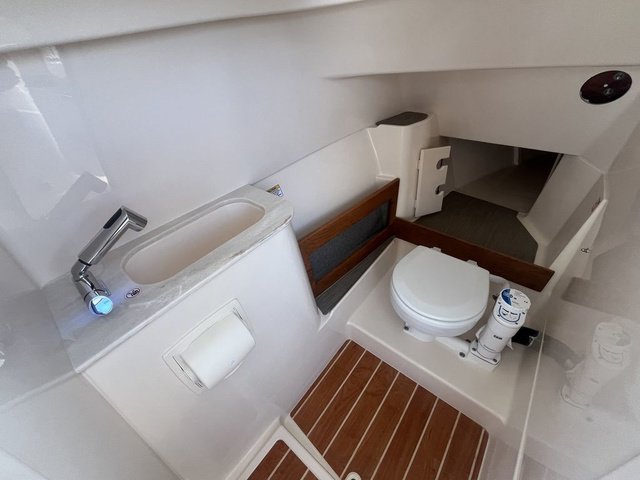- Head – lockable port console w/dome light, bulk storage, mirror w/shelf, composite cherry & holly sole, sink & marine head w/electric flush, 10-gallon (38 l) holding tank w/macerator, overboard discharge & deck pump out