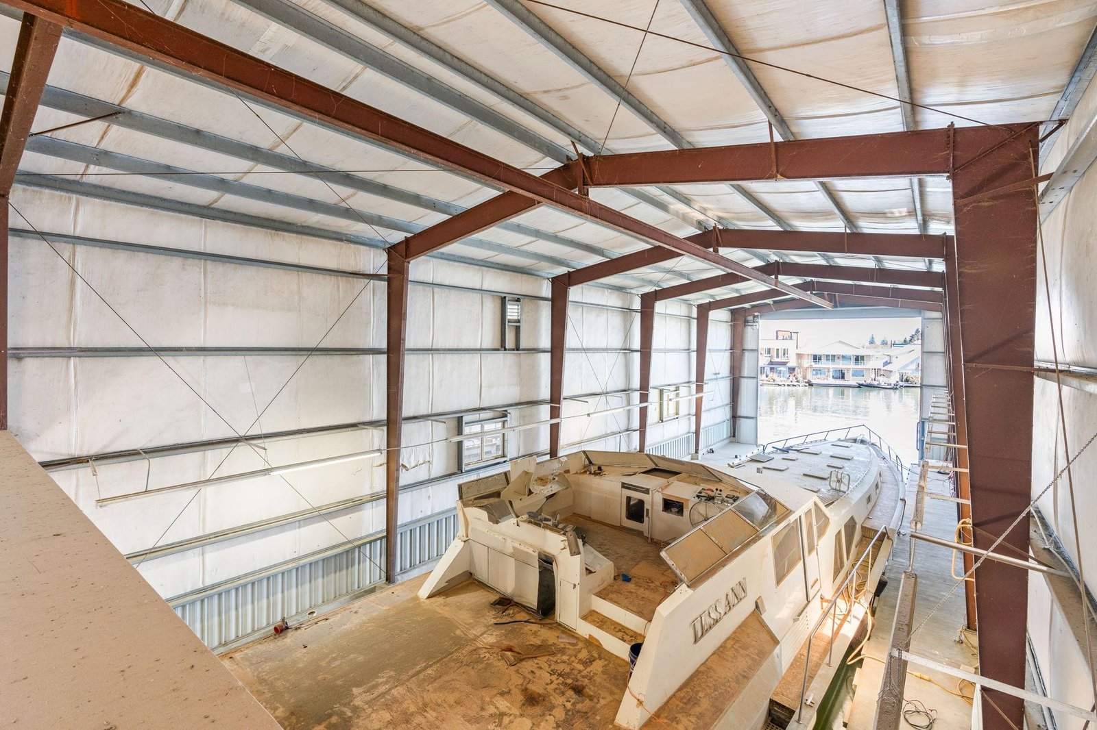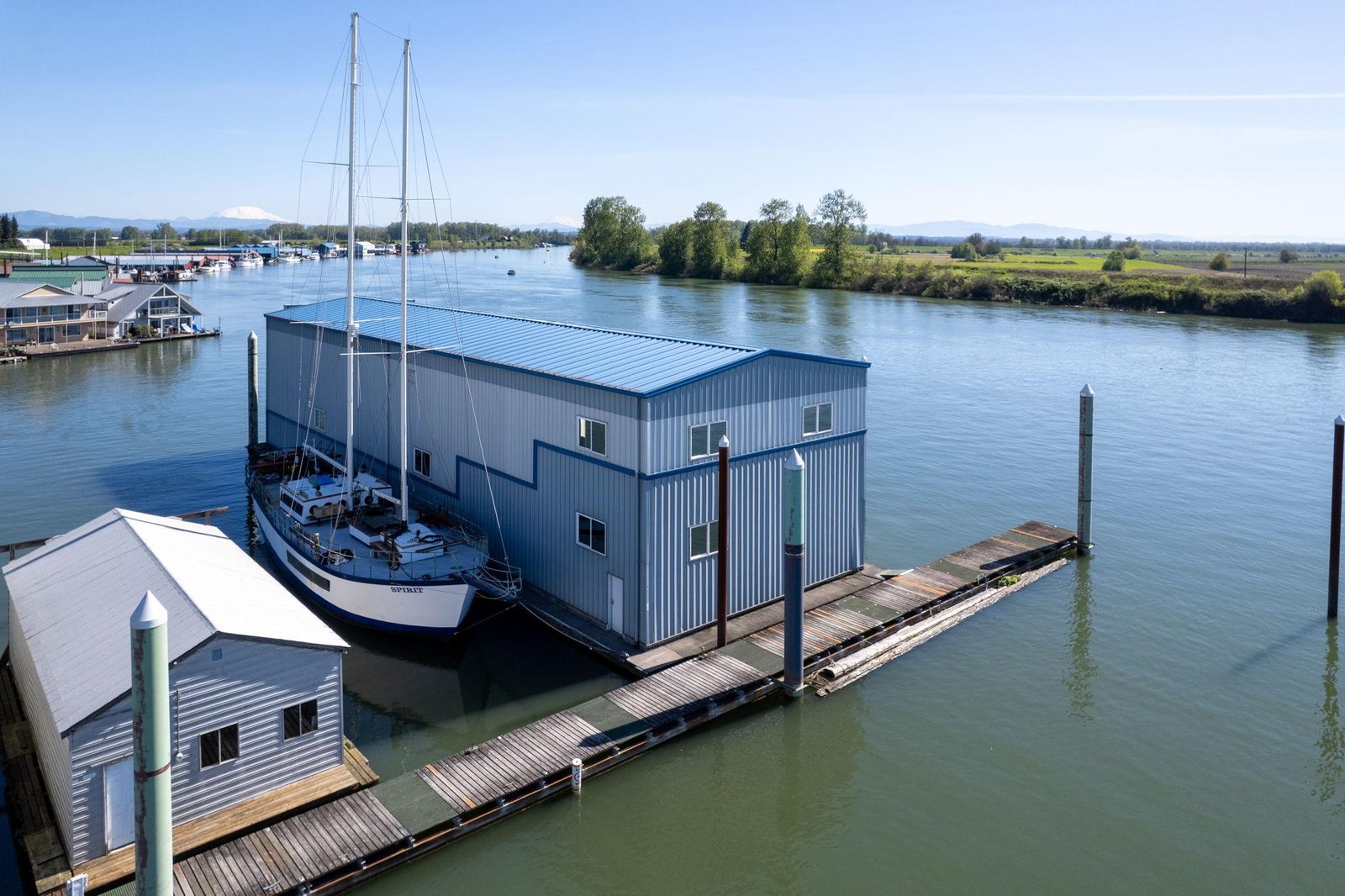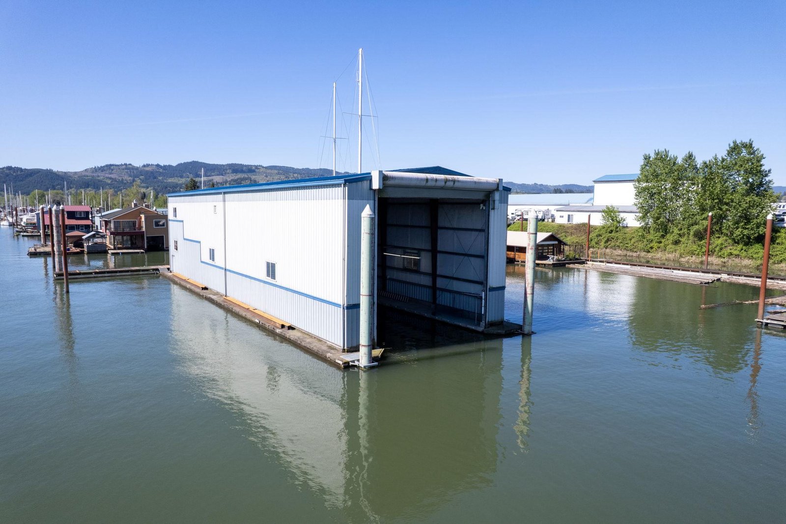 Located on the Multnomah Channel in Scappoose, OregonThis custom-built boathouse is designed to provide maximum protection for your valuable yacht while offering the flexibility to add comfortable living or work space above. Constructed in 1985 and built to commercial-grade standards, the structure features a spacious 26’ x 116’ boatwell, oversized 28’ x 30’ electric roll-up door, and heavy-duty steel frame construction.A large 22’ x 40’ mezzanine, accessed by a steel staircase, is ideal for storage but can easily be converted into a loft-style living area — perfect for weekend stays, full-time use, or an office/workshop setup right on the water. Whether you’re storing a cruiser, sport yacht, or classic vessel, this boathouse offers serious protection from the Northwest’s wind, rain, and sun.The float is constructed with concrete decking over foam for long-lasting, low-maintenance durability. Insulated steel siding and roof provide added climate control and year-round usability.Currently moored on the scenic Multnomah Channel in Scappoose, Oregon, the boathouse is available with a long-term lease in its current location or can be relocated if desired.Key Features Boatwell Dimensions: 26’ x 116’ – accommodates large yachts Steel Roll-Up Door: 28’ x 30’ electric automatic door Overall Structure: 46’ x 144’ Float Construction: Concrete decking over foam for low-maintenance, long-lasting service Three underwater steel trusses for added structural support with 7′ draft capacity Framing: All-steel I-beams, purlins, and girts Roof & Siding: Insulated steel for protection against moisture and temperature swings Mezzanine Loft: 22’ x 40’ with steel staircase – excellent for storage or conversion to living space