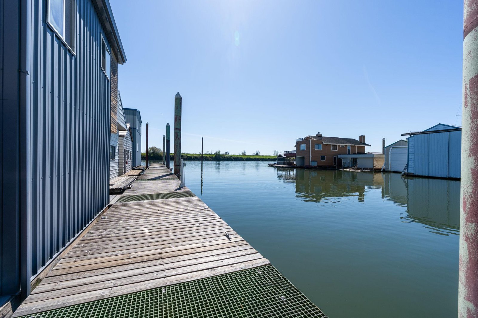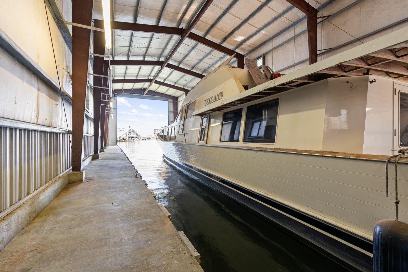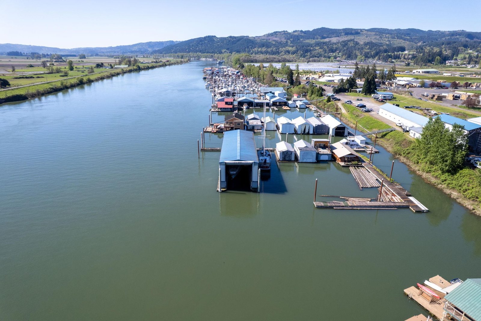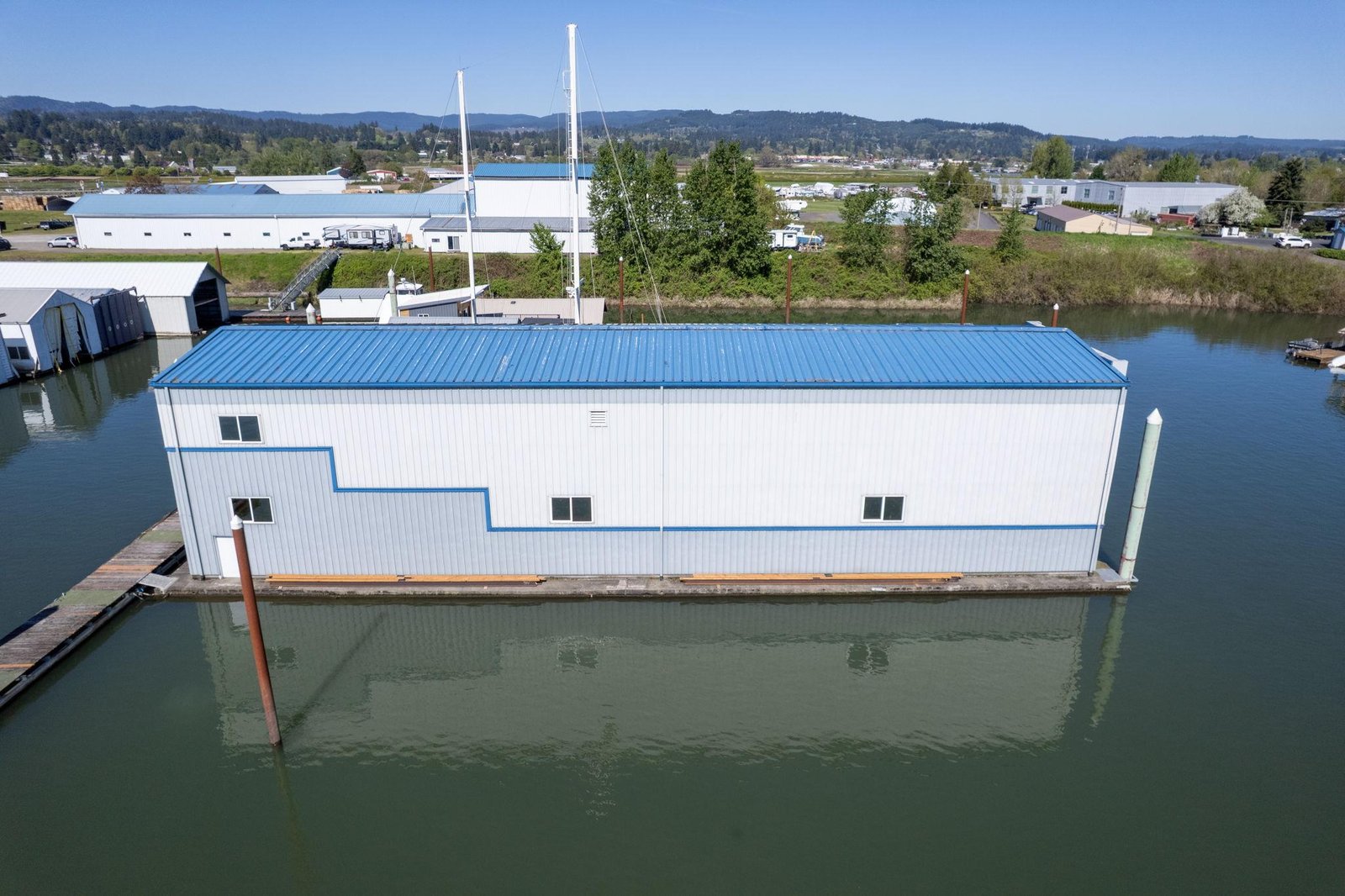 Located on the Multnomah Channel in Scappoose, OregonThis custom-built boathouse is designed to provide maximum protection for your valuable yacht while offering the flexibility to add comfortable living or work space above. Constructed in 1985 and built to commercial-grade standards, the structure features a spacious 26’ x 116’ boatwell, oversized 28’ x 30’ electric roll-up door, and heavy-duty steel frame construction.A large 22’ x 40’ mezzanine, accessed by a steel staircase, is ideal for storage but can easily be converted into a loft-style living area — perfect for weekend stays, full-time use, or an office/workshop setup right on the water. Whether you’re storing a cruiser, sport yacht, or classic vessel, this boathouse offers serious protection from the Northwest’s wind, rain, and sun.The float is constructed with concrete decking over foam for long-lasting, low-maintenance durability. Insulated steel siding and roof provide added climate control and year-round usability.Currently moored on the scenic Multnomah Channel in Scappoose, Oregon, the boathouse is available with a long-term lease in its current location or can be relocated if desired.Key Features Boatwell Dimensions: 26’ x 116’ – accommodates large yachts Steel Roll-Up Door: 28’ x 30’ electric automatic door Overall Structure: 46’ x 144’ Float Construction: Concrete decking over foam for low-maintenance, long-lasting service Three underwater steel trusses for added structural support with 7′ draft capacity Framing: All-steel I-beams, purlins, and girts Roof & Siding: Insulated steel for protection against moisture and temperature swings Mezzanine Loft: 22’ x 40’ with steel staircase – excellent for storage or conversion to living space
