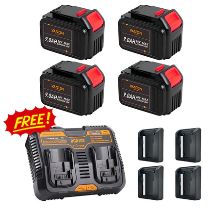 Power up your DeWalt tools with this high-capacity 20V MAX 9.0Ah battery replacement pack! This bundle includes four premium-quality batteries compatible with DeWalt DCB200, providing extended runtime and reliable performance for all your heavy-duty projects. Get more done with less downtime. Each battery features advanced lithium-ion technology for optimal power and longevity. This set also includes a free charger to keep your batteries ready to go, plus convenient holders for easy storage and organization. Maximize your productivity and save money with this exceptional value pack. Perfect for contractors, DIY enthusiasts, and anyone who demands the best from their power tools.
