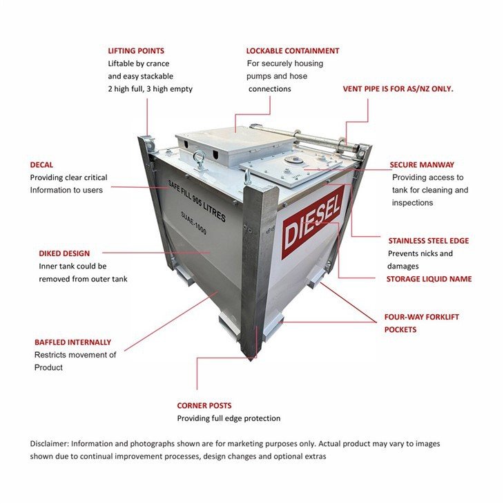 Sumac SUAE series cube self bunded tanks come in various sizes. We have a Fuel Tank suitable for all your fuel storage requirements. Sumac’s new fuel cube tanks come with lockable containments to keep your parts and connections secure and out of the elements. Tanks also come equipped with convenient lifting points to simplify crane handling and positioning your tank.